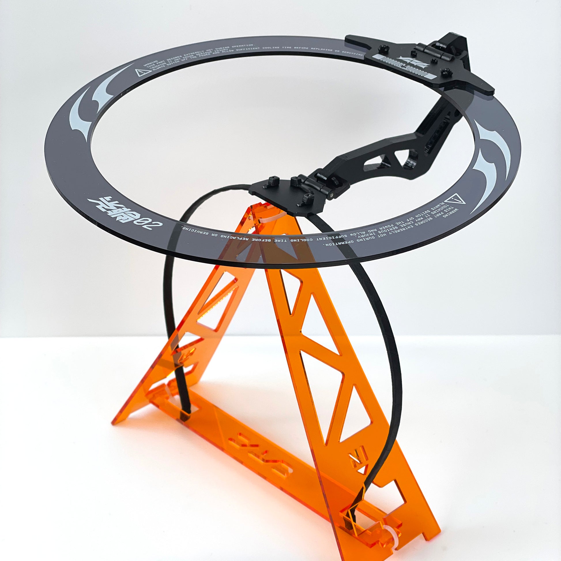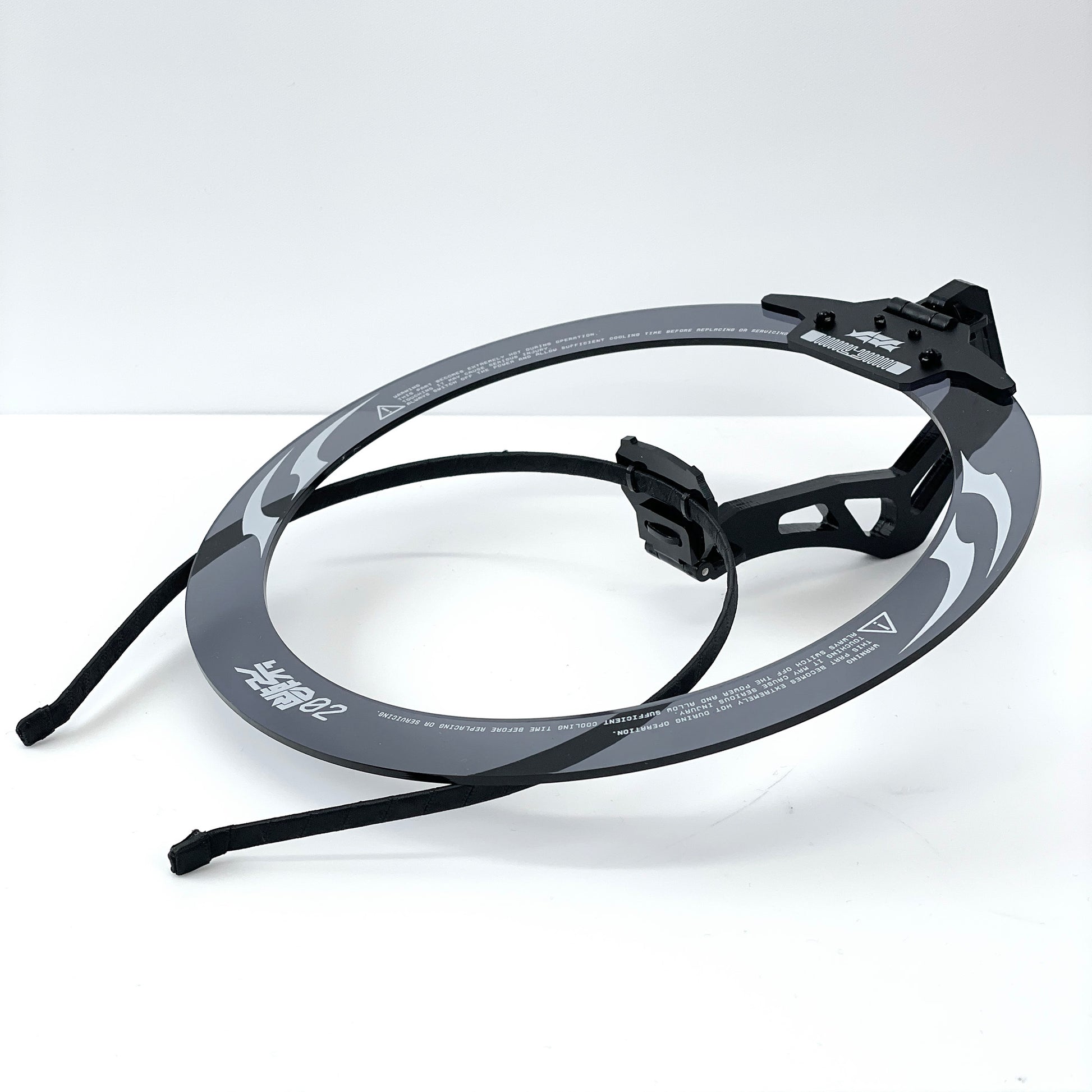A headband-style unit that can hold a circular transparent part above the head. The mechanically designed arm is equipped with two torque hinges, allowing the part to be held at any angle.