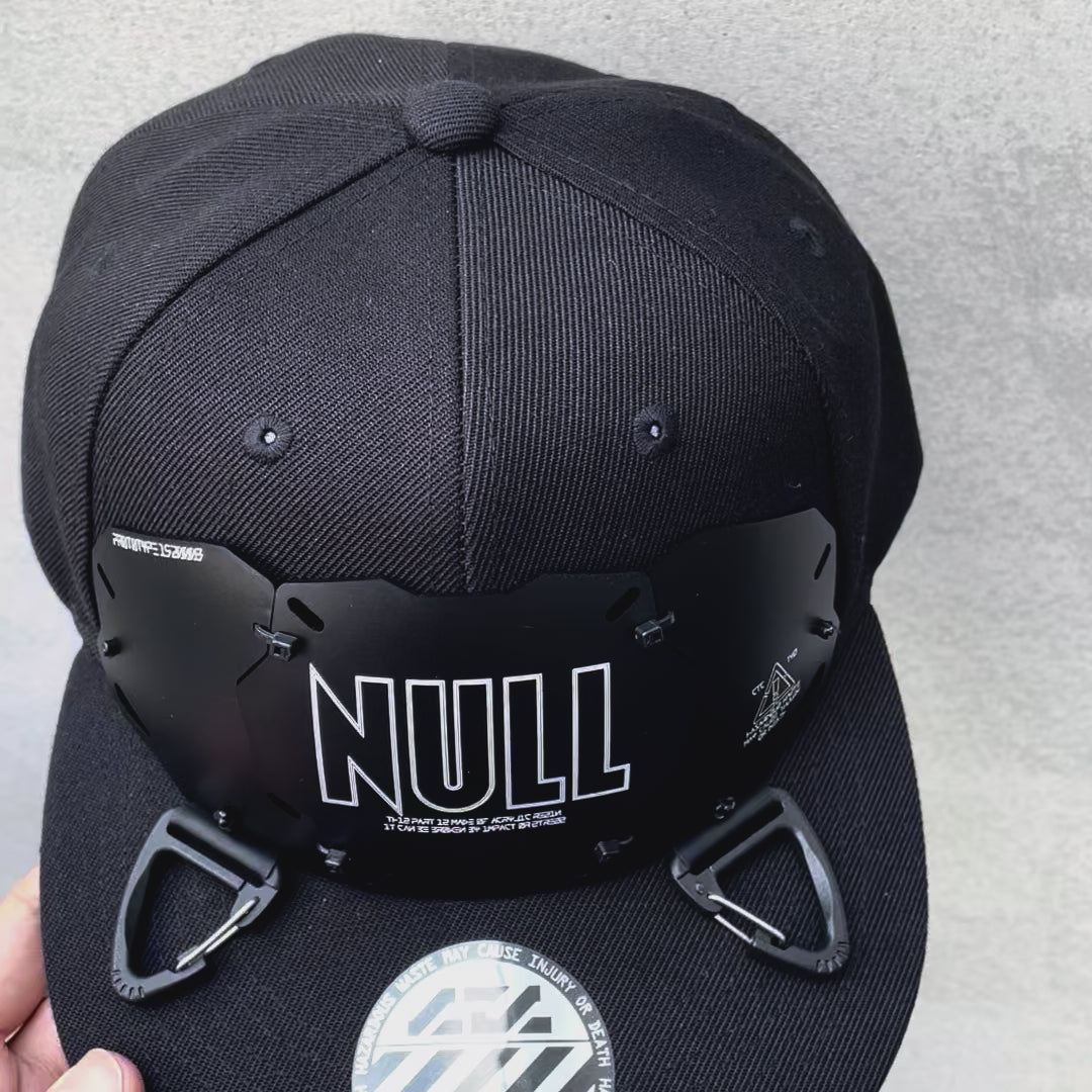 Snapback flat visor cap with acrylic resin armor on the front. Carabiners on both sides add a mechanical accent. Free size. Washable.