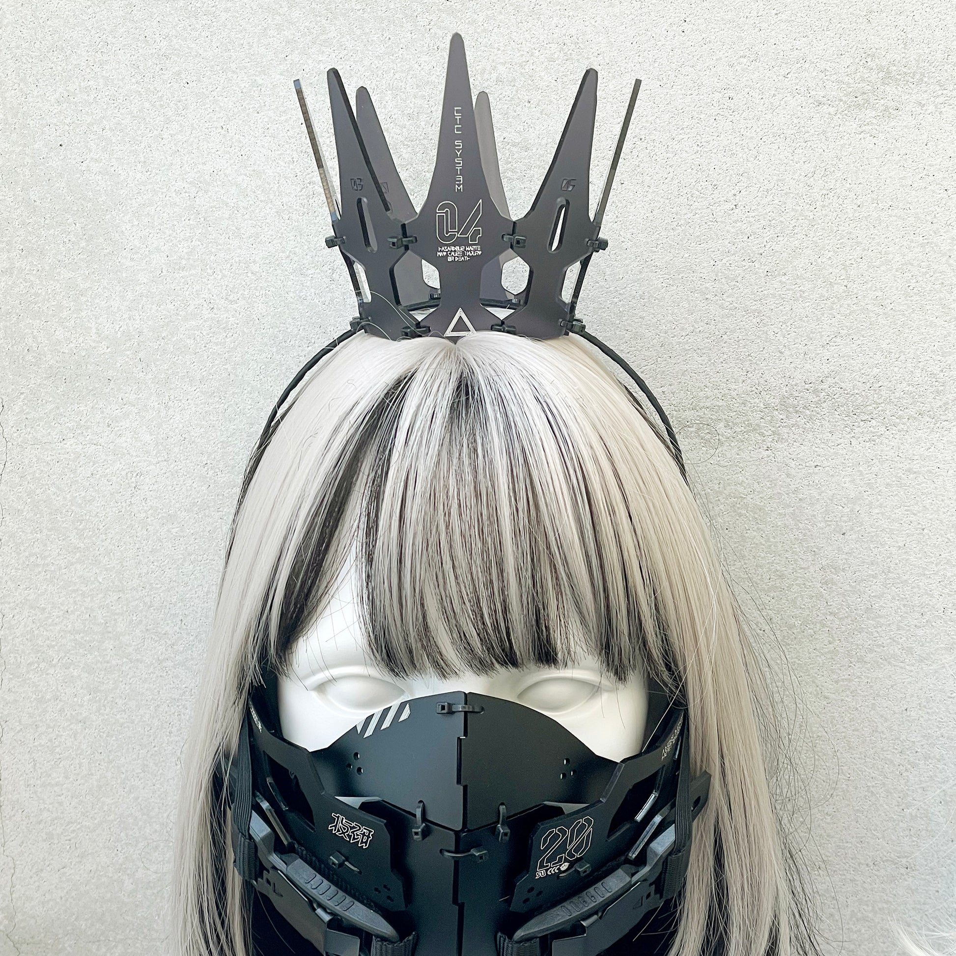 Crown-shaped accessory with a sharp and aggressive shape reminiscent of an industrial product. The headband is made of acrylic resin. The position of the crown can be moved.
