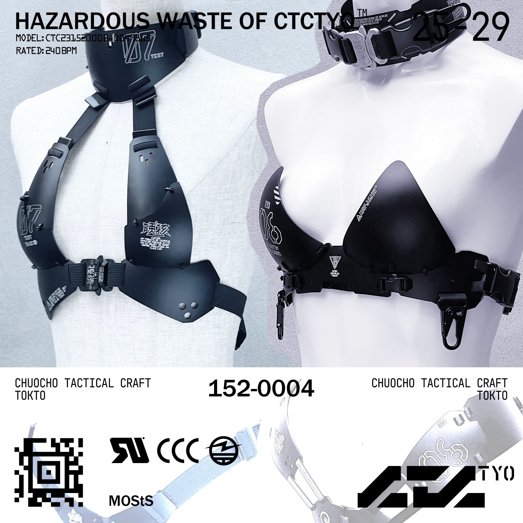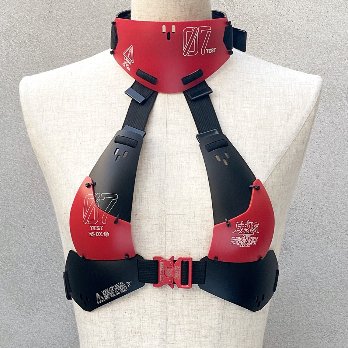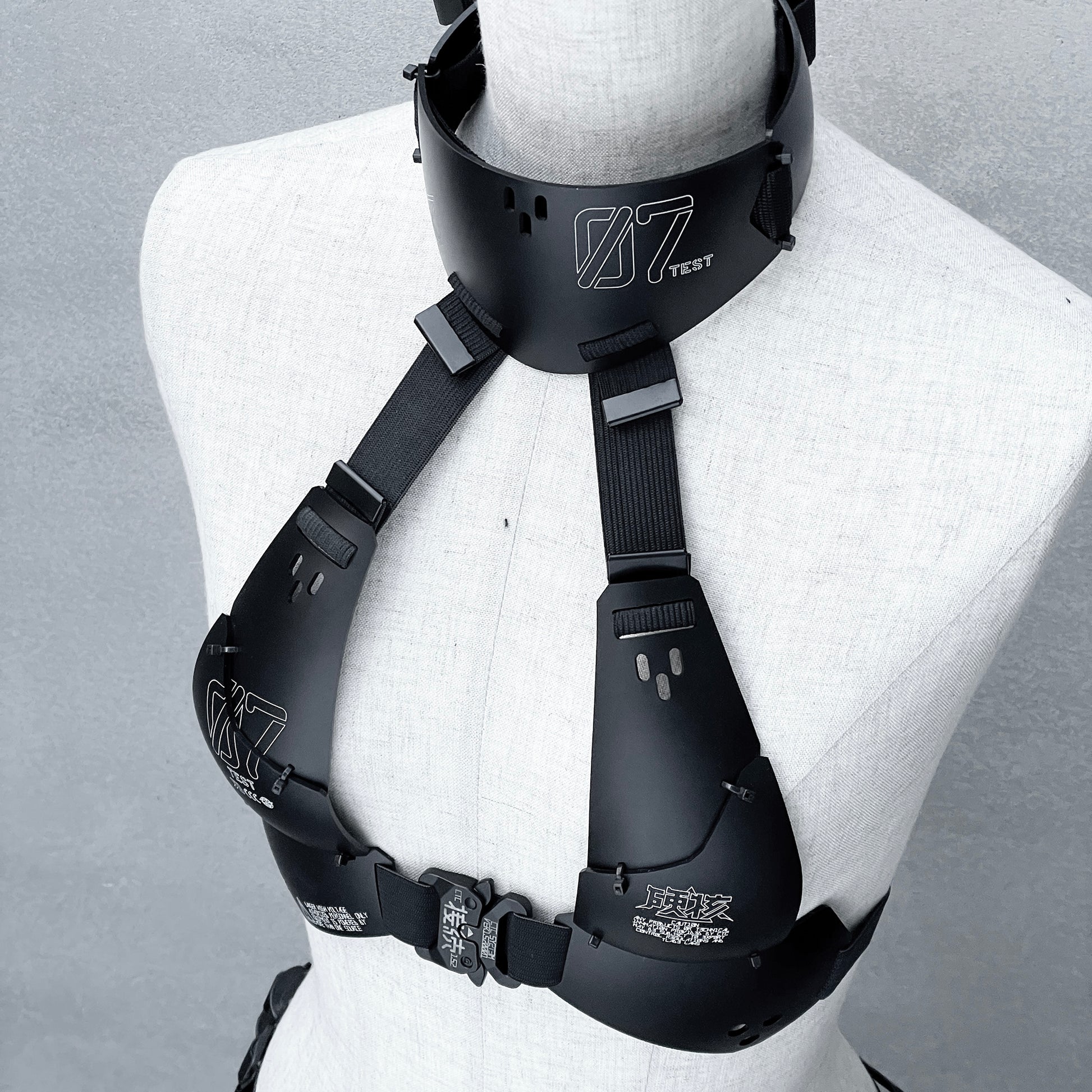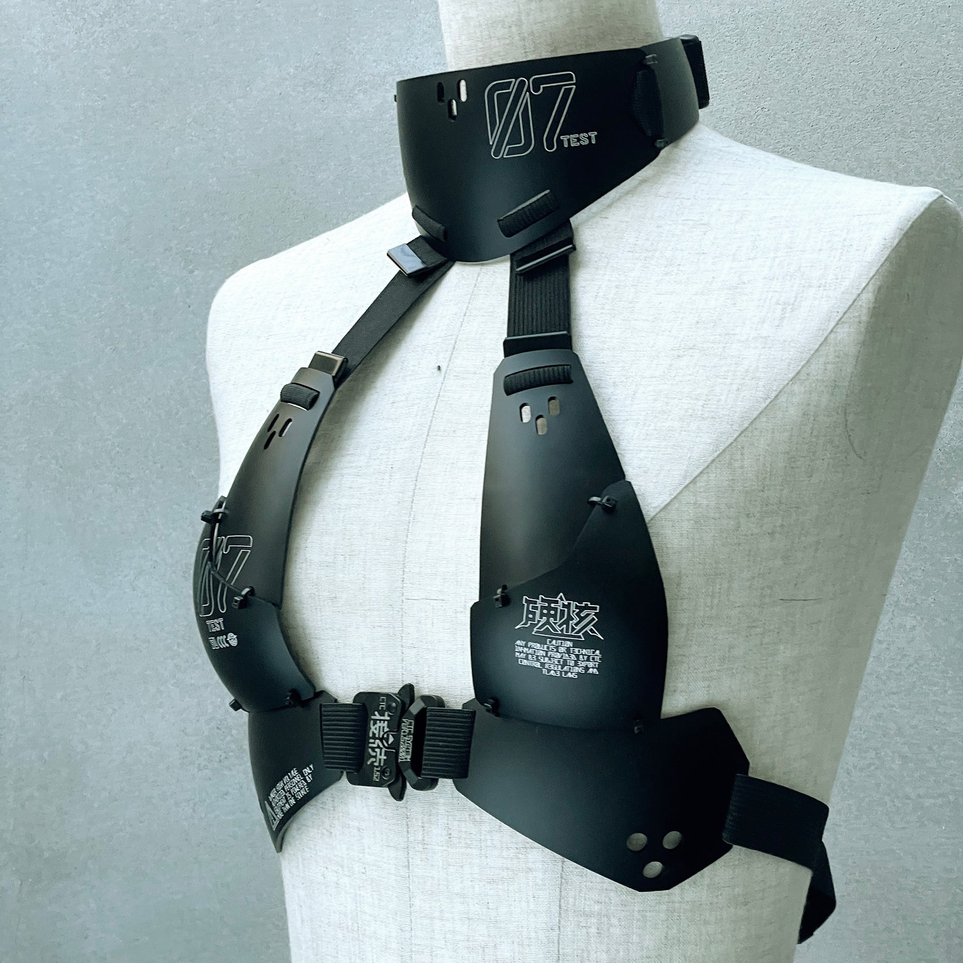レーザーカットした樹脂板を独自技術で熱曲げ加工した装甲ビキニトップ チョーカーと一体化したブラは、首後ろ、背中、カップ上の各部でサイズ調整が可能