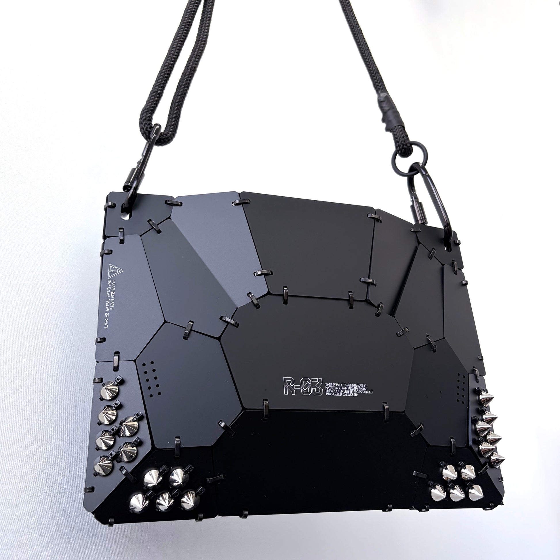 バッグにものを入れたときに平面がどう変形するかを観察し、バネル分割ラインのデザインとして構築したアクリル樹脂製の装甲サコッシュ。