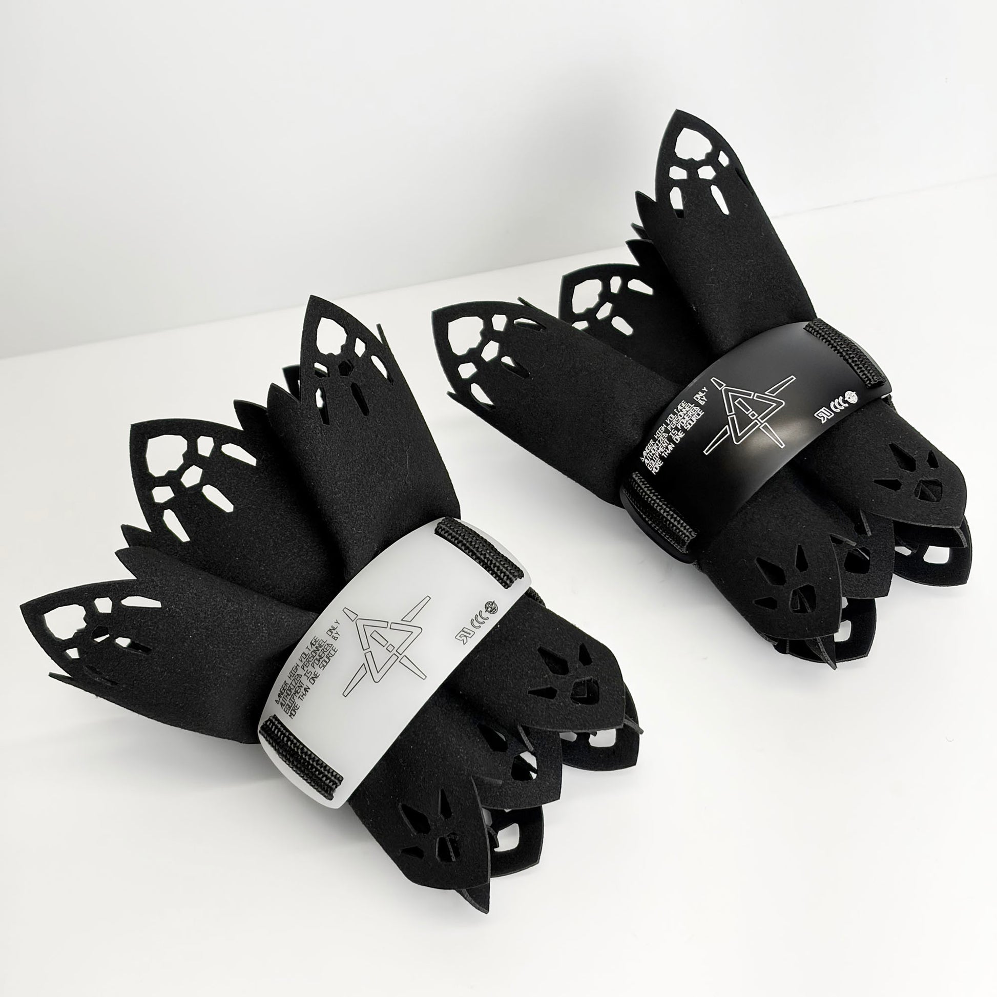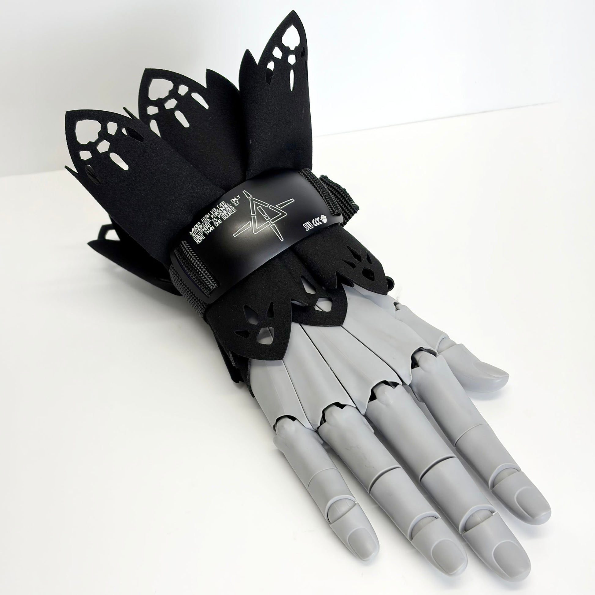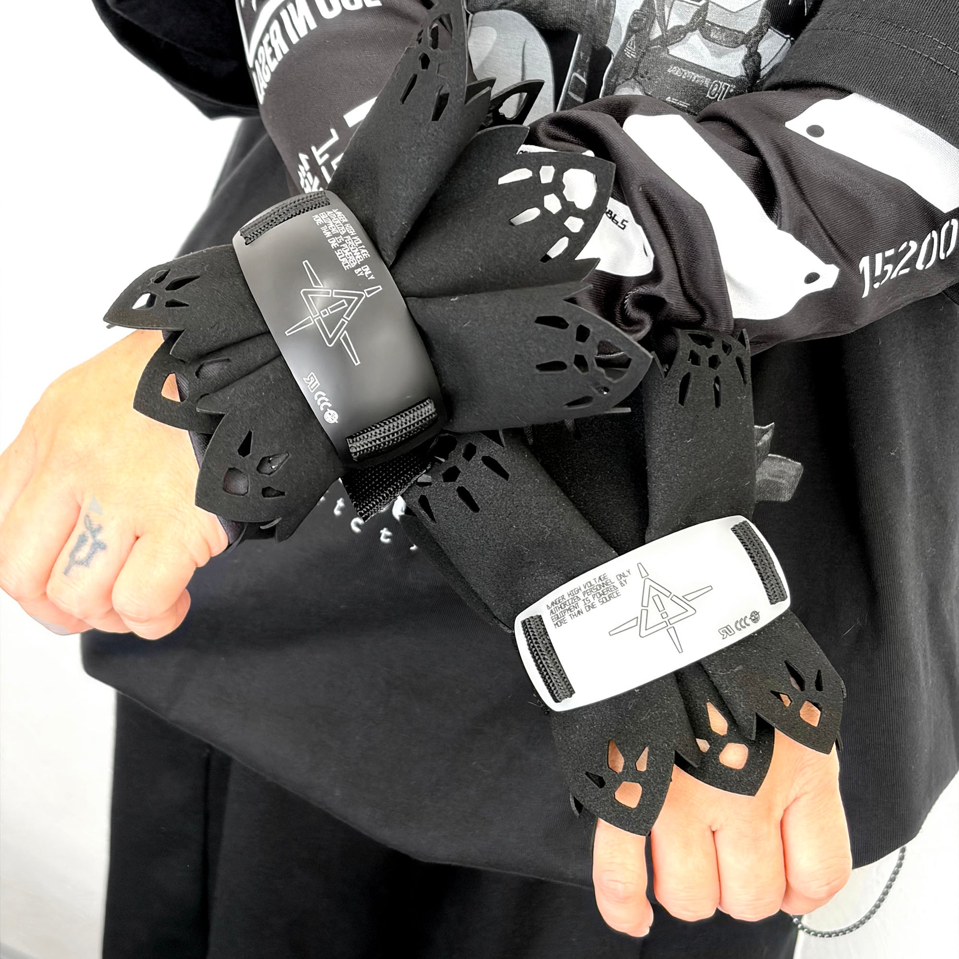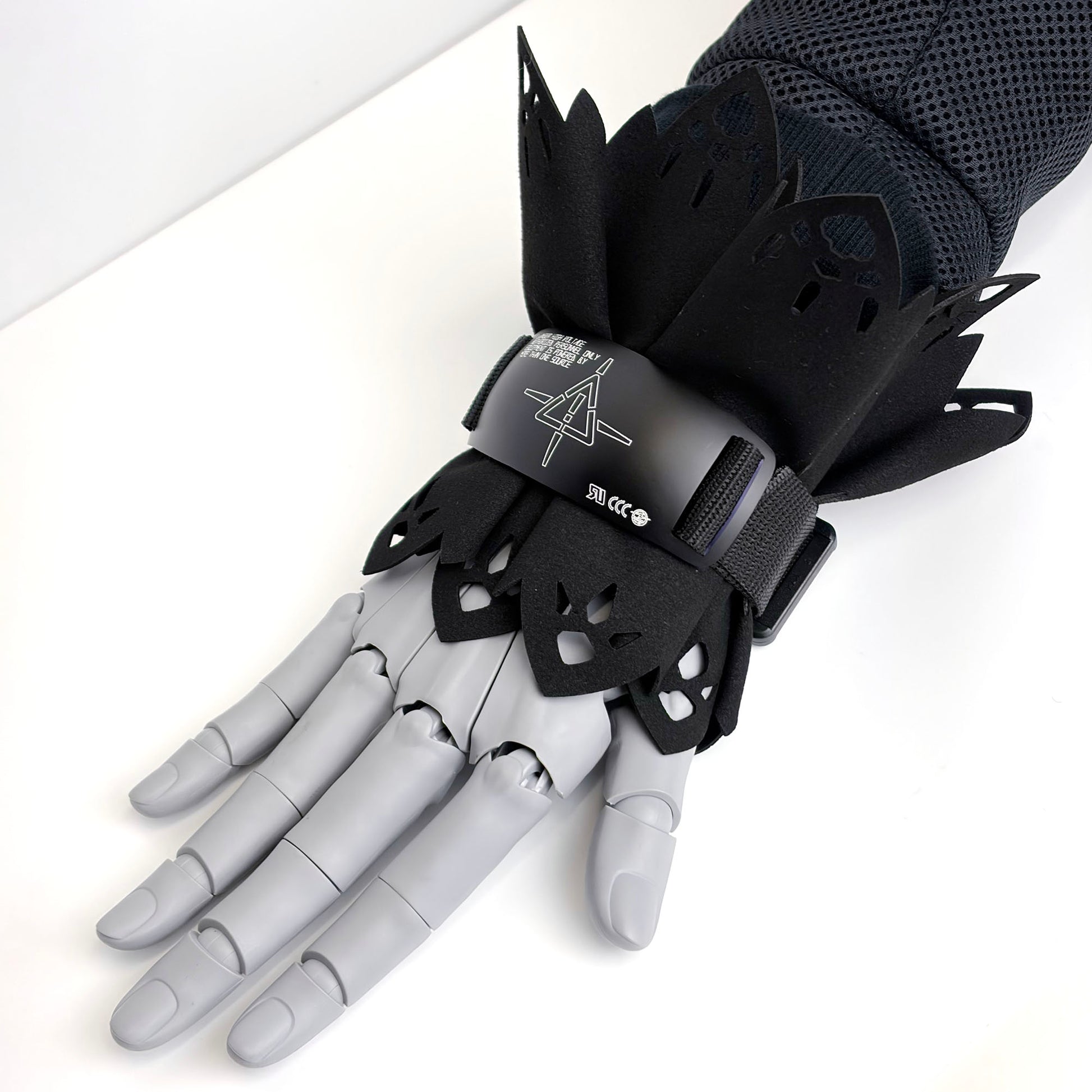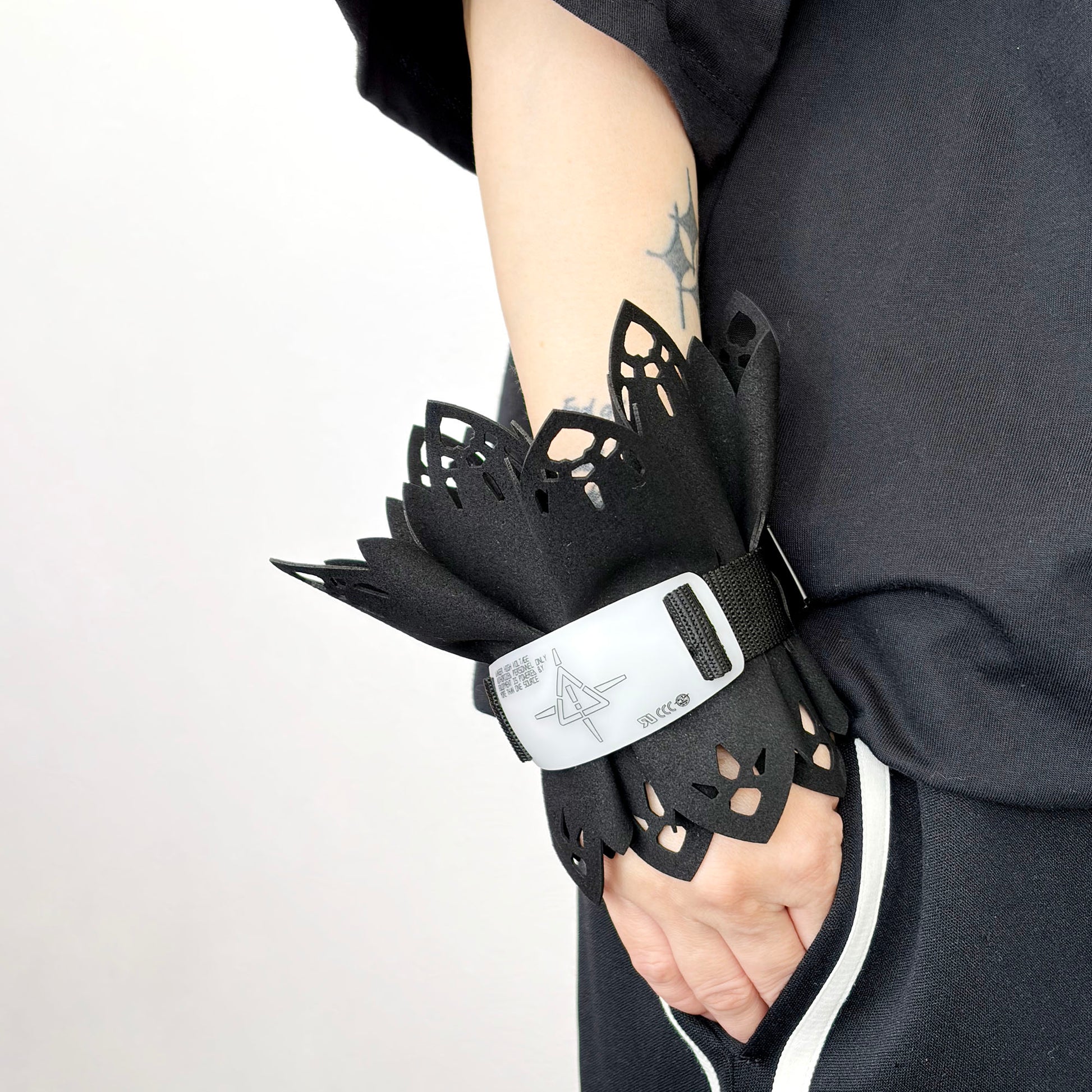 レーザーカットした合成スエード生地で作られた、立体的に広がる大型フリルつきリストバンド。