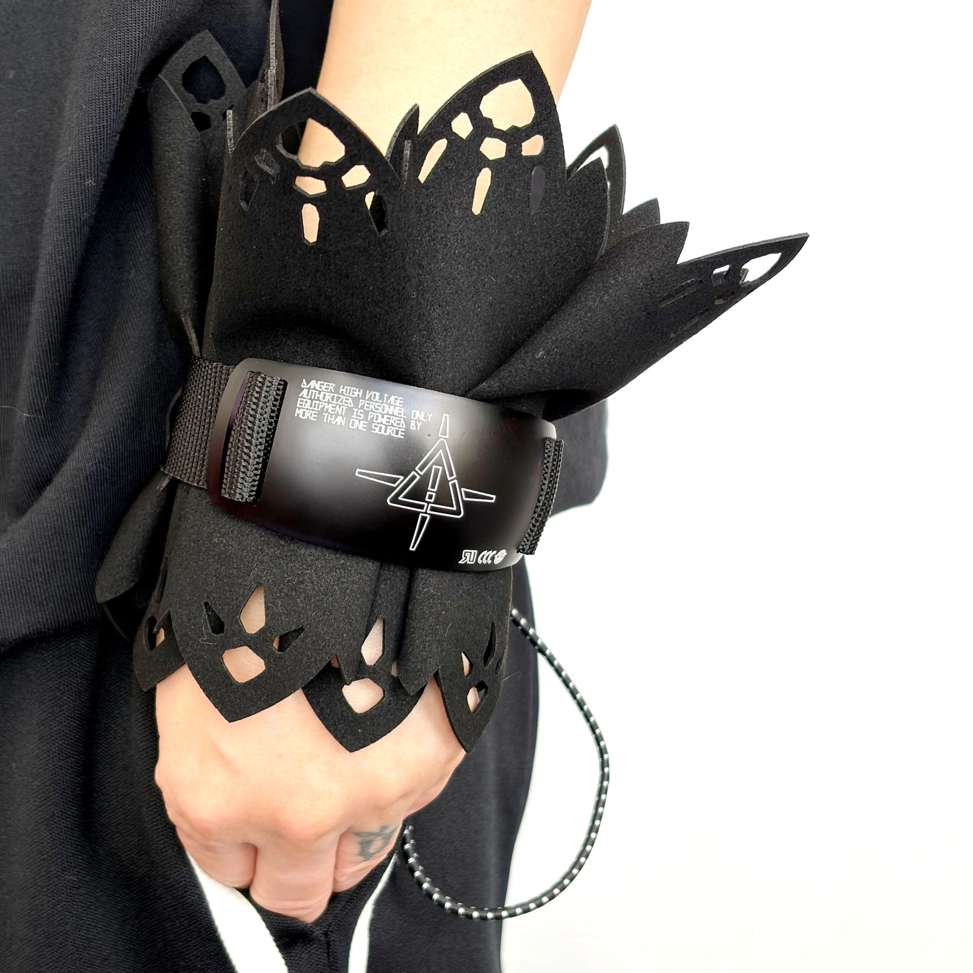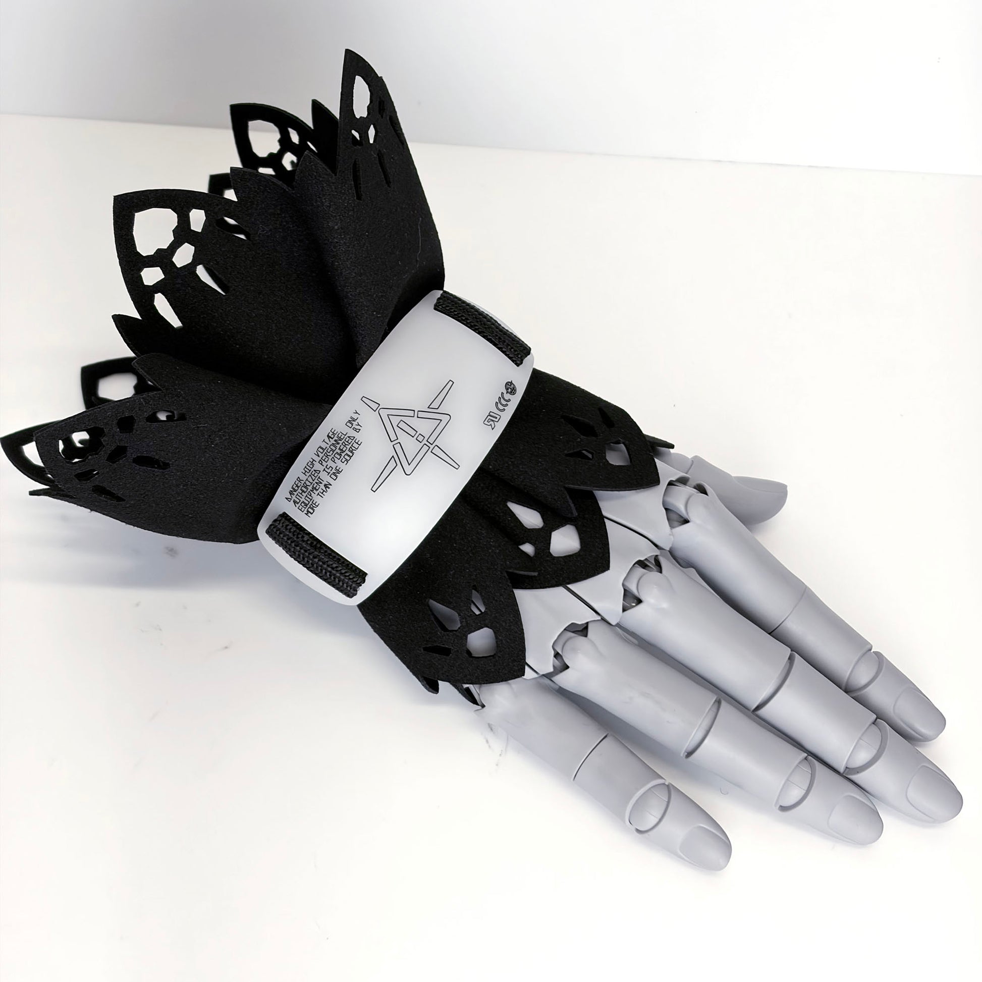 A large, three-dimensional ruffled wristband made from laser-cut synthetic suede fabric.